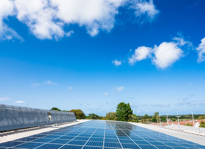 In a joint project between Guernsey Electricity and Guernsey Post, this array of 654 panels on the roof of the Guernsey Post Headquarters is one of the largest solar photovoltaic (PV) systems in the Channel Islands.